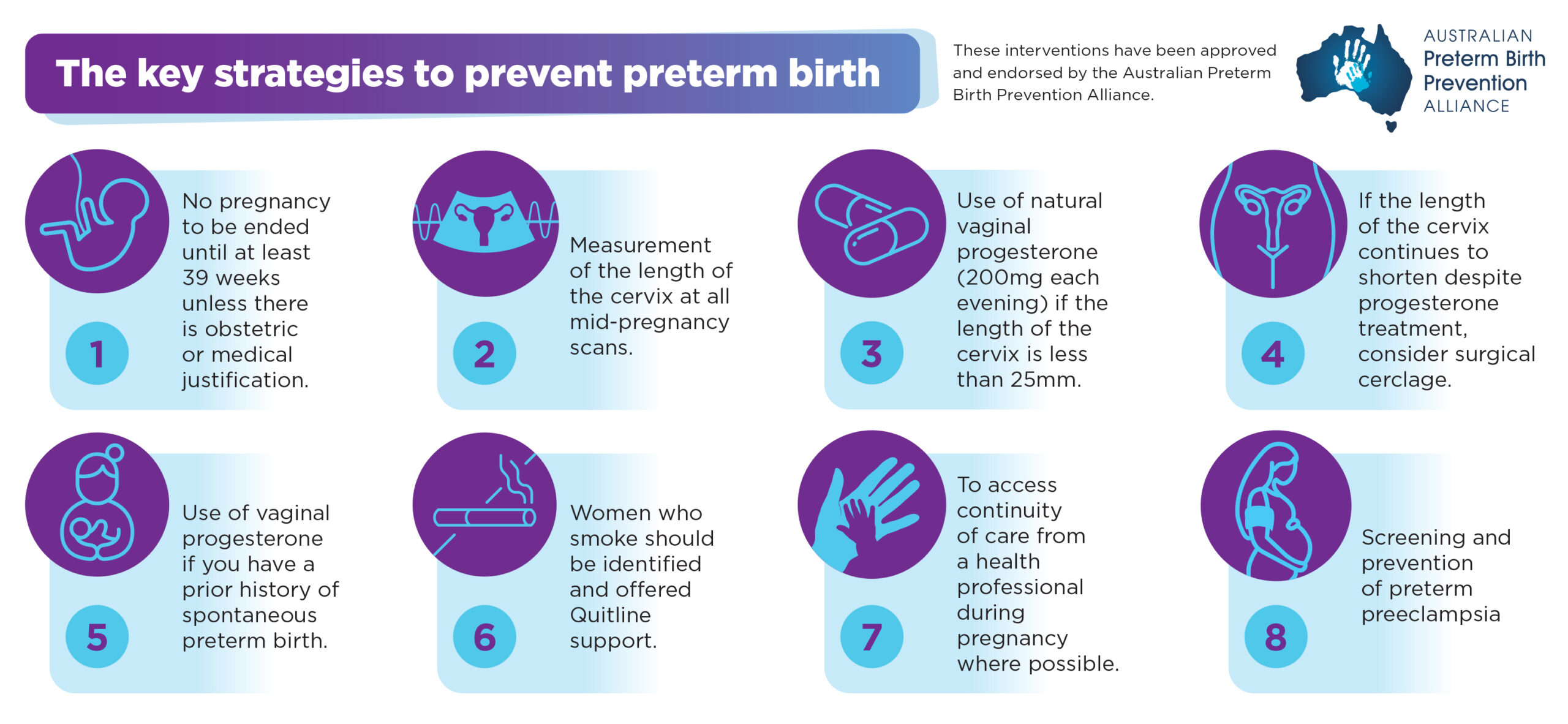 In Australia 1 in every 12 pregnancies end too early – leading to more than 26,000 preterm births every year. Most children are born too early to go on to lead normal and productive lives. But for many others, there may be serious medical problems followed by life-long disability. The following preterm birth prevention interventions will be recommended for application into all clinical practices over the coming years.